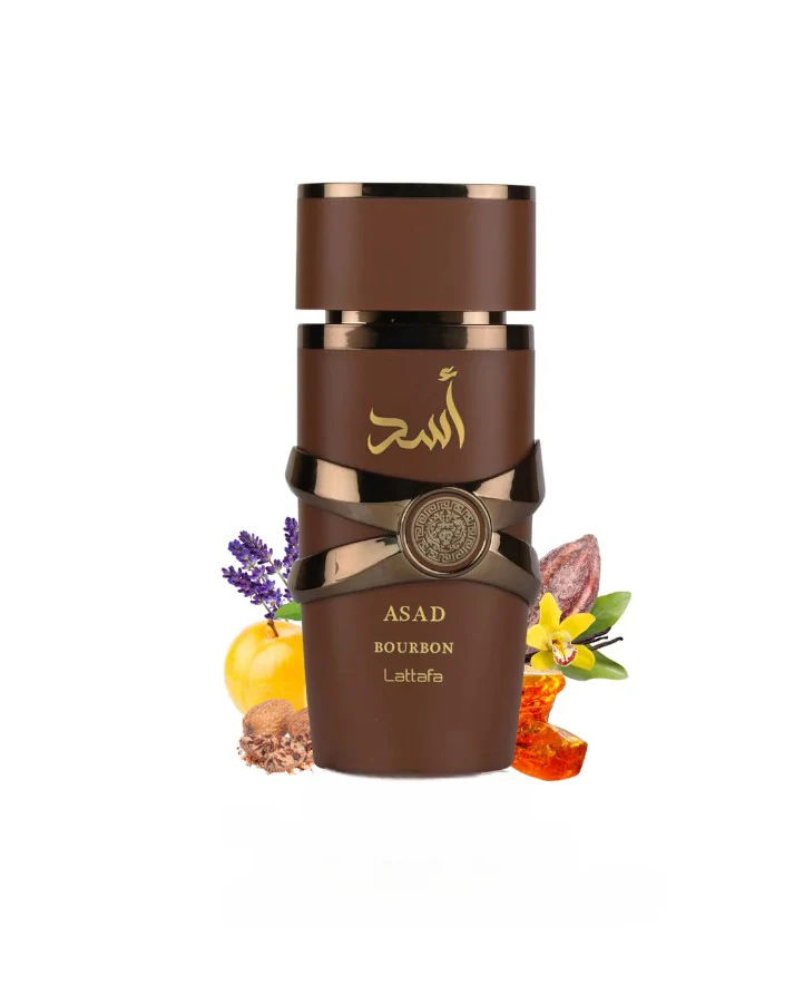 Asad Bourbon de Lattafa Perfumes es una fragancia de la familia olfativa Oriental Especiada para Hombres. Esta fragrancia es nueva. Asad Bourbon se lanzó en 2025. Las Notas de Salida son lavanda, ciruela Mirabel y pimienta rosa; las Notas de Corazón son cacao, nuez moscada y Davana; las Notas de Fondo son vainilla Bourbon, ámbar y vetiver.